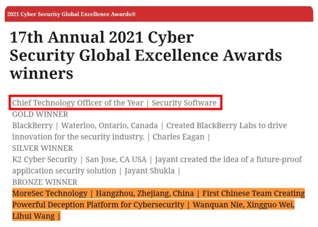 企业服务:默安科技欺骗防御斩获2021 Cyber Security全球卓越奖