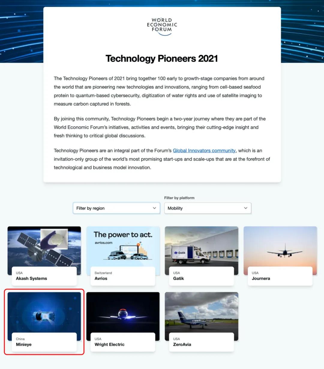 前沿科技:世界经济论坛发布2021“全球技术先锋”榜,MINIEYE成为8家获选中国企业之一
